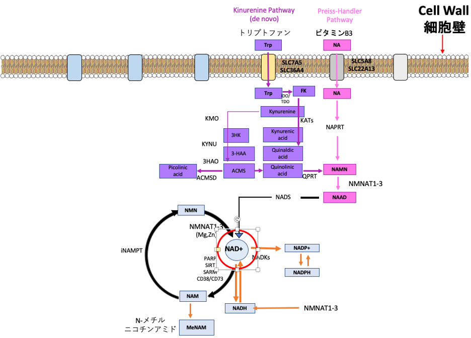 NAD+は、ビタミンB3(プレイス・ハンドラー経路と呼ばれる経路)などの前駆体から体内で合成されるのが一般的な経路です。また、アミノ酸のトリプトファンからも合成可能であり、こちらは「de novo合成経路(=前駆体からの新規合成経路)」と呼ばれます。