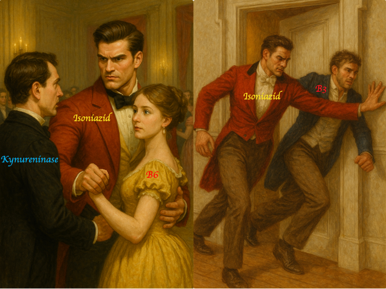 さらに、イソニアジドはビタミンB6と結合します(「愛する者」=下図左)。その結果、トリプトファンを出発点とするキヌレニン経路(上図の紫の経路)が途中で妨げられ、完了することができず、つまり「紳士(トリプトファン)が女性(NAD+)を得る」ことができなくなります。したがって、この経路でもNAD+は合成されません。