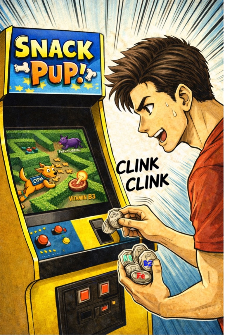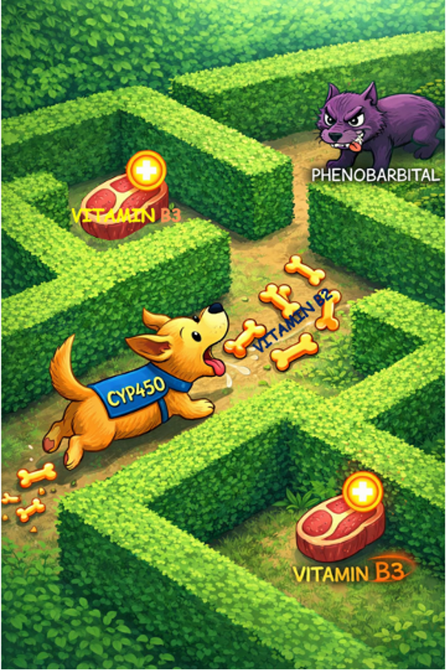 スナック・パップは、CYP450(肝臓のシトクロムP450酵素)と呼ばれる酵素です。この酵素が機能するためには、食料としてビタミンB2(リボフラビン)という“骨”を摂取する必要があります。しかし、スナック・パップが“イタチ”(フェノバルビタール)をかじる(代謝する)ためには、ビタミンB3(NAD+)という“パワーステーキ”でパワーアップしなければなりません。ビタミンB2やB3(NAD+)が不足すると、イタチは体外へ追い出されることなく残ってしまいます。