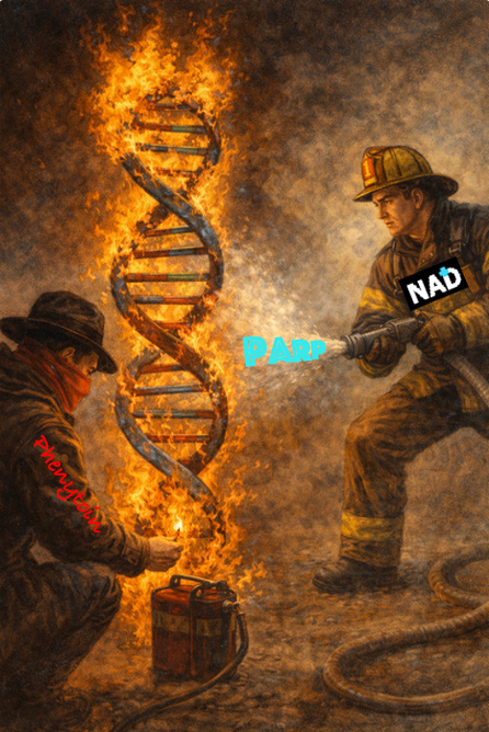 一般的な言い方をすれば、フェニトインという「放火魔」によって抗酸化物質が枯渇すると、細胞のDNAという「建物」が損傷し始め、それを消火するために「水(PARP)」が必要となります。ところが、「消防士(NAD+)」がホースを持ち続けることに疲れてしまい(=枯渇すると)、修復能力が低下し、NAD+欠乏が本格化してしまうというわけです。