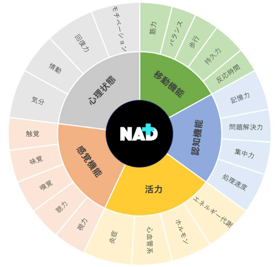 このサンバーストチャート<図1>は、NAD+が私たちの体の中でどれほど多くのことをしてくれているかを、わかりやすく視覚的に示しています。