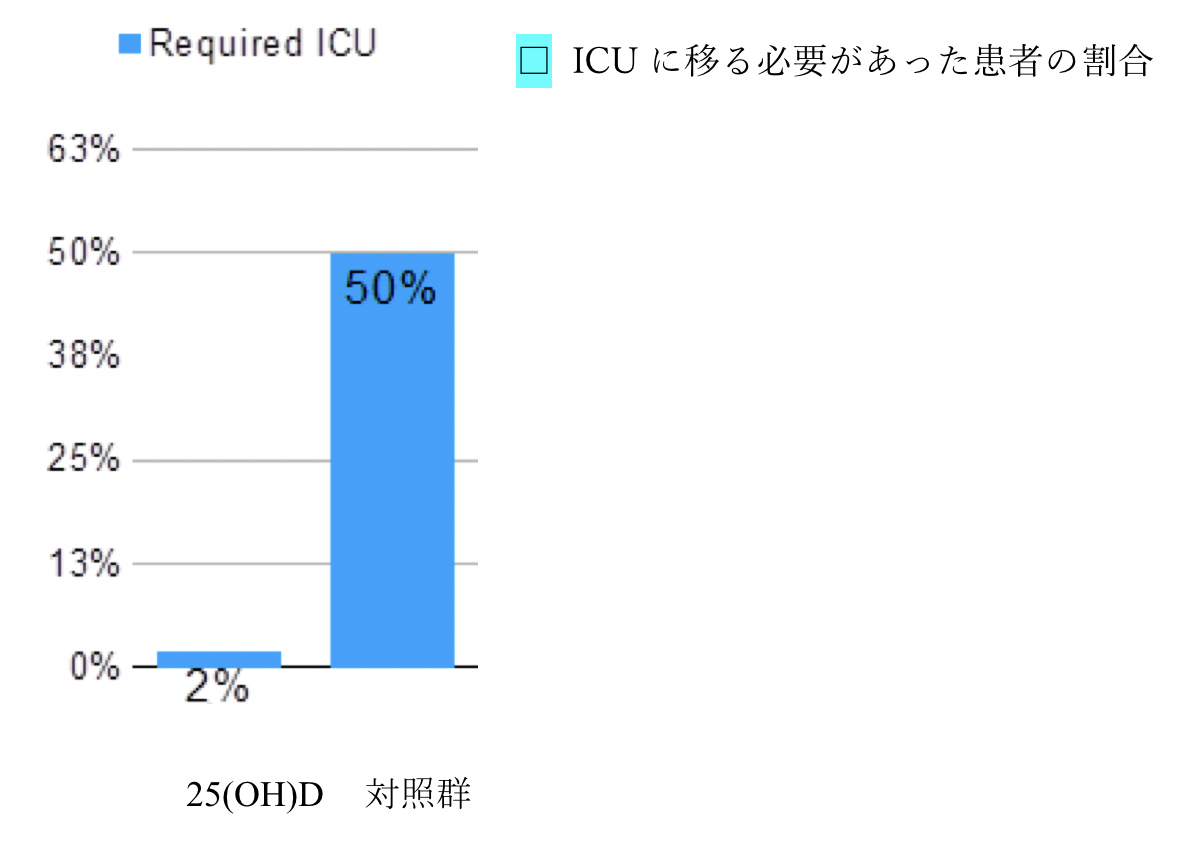さてその結果は? 下のグラフをご覧ください。集中治療室(ICU)に移る必要があった患者の割合は、対照群では50%であったのに対し、25 (OH) D (25-ヒドロキシビタミンD )投与群ではわずか2%(つまり50人のうち1人だけ)でした。