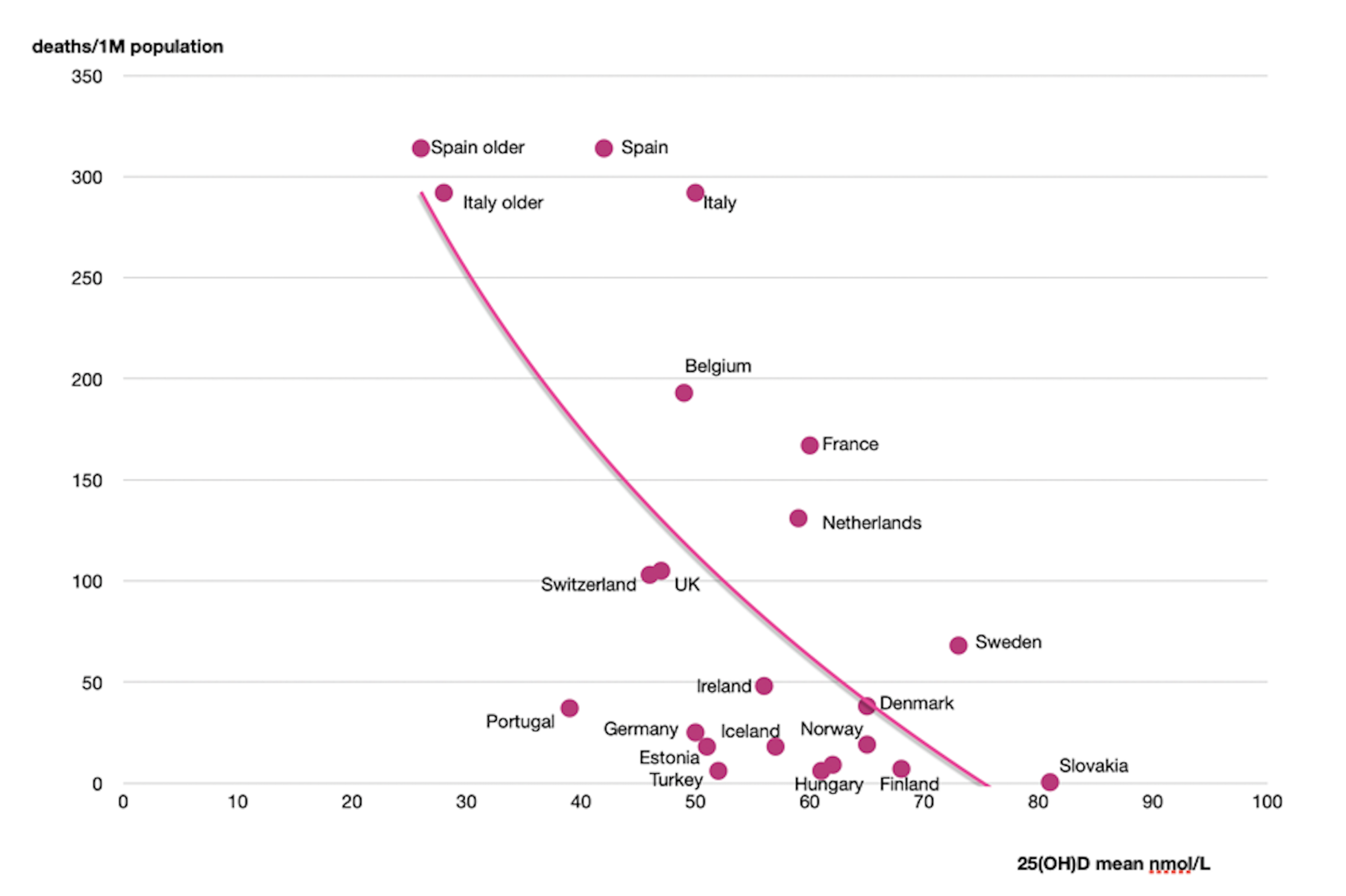 欧州諸国の場合、COVID-19(新型コロナウイルス感染症)の発症とそれによる死亡の確率は、血中ビタミンD濃度の母平均と負の相関関係にあり、濃度が75 nmol/Lあたりを超えるといずれの確率もゼロになることが下図からはっきりわかります[7]。このグラフはオリジナルデータから再描画されたもので、上のほうに目を向けると、スペインとイタリアの高齢者は血中ビタミンD濃度がかなり低いことがわかります。
